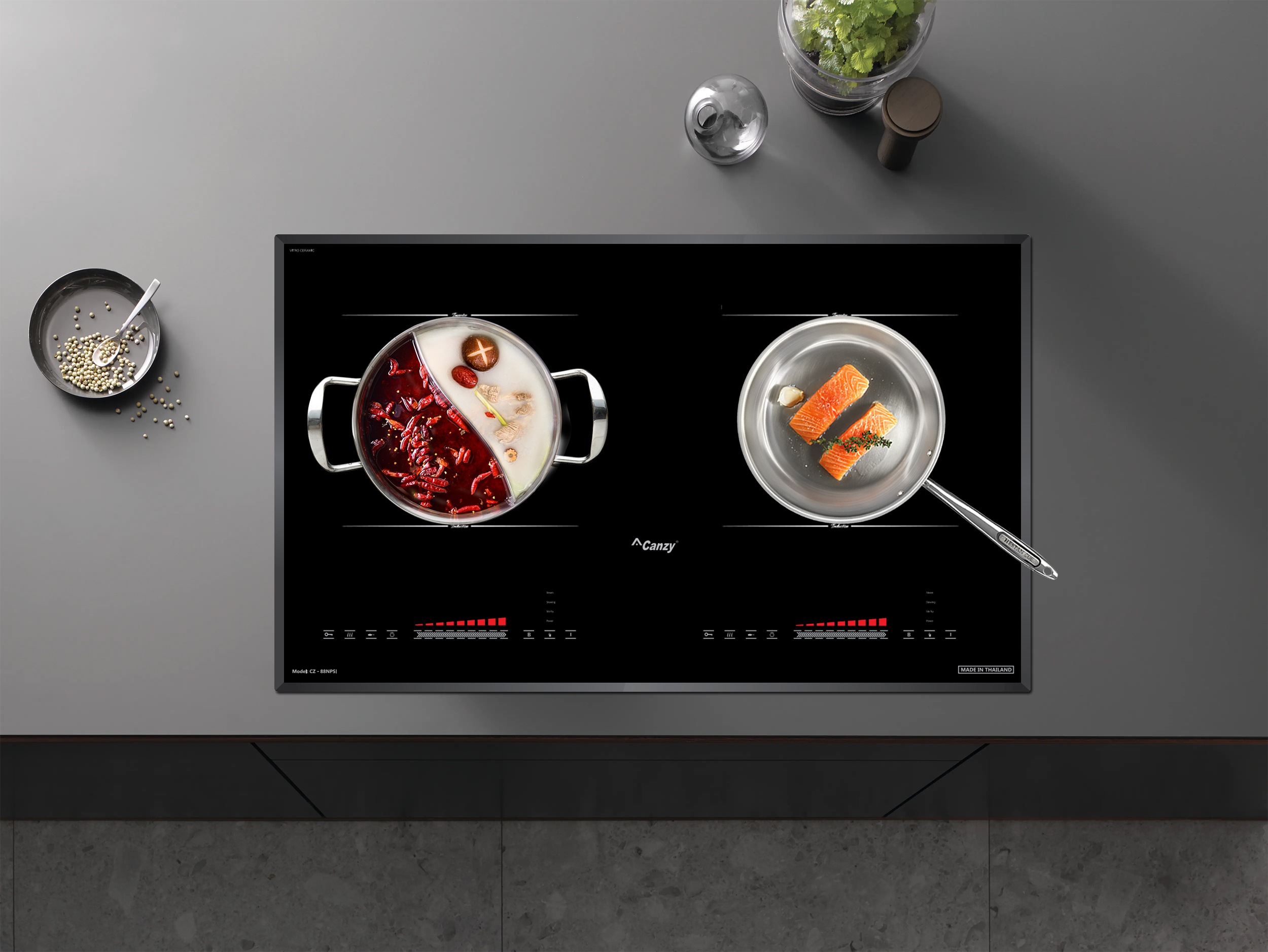 Bếp từ Canzy nhập khẩu Thái Lan và Malaysia là dòng bếp đa dạng về thiết kế, số vùng nấu, kích thước nên phù hợp với mọi không gian phòng bếp Việt. Bếp có thiết kế hiện đại, sang trọng giúp cho căn bếp thêm phần hiện đại, mang đậm phong cách Châu Âu.