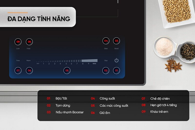 Không chỉ thế, bếp từ âm này cũng được nhà sản xuất đưa tới hàng loạt các trang bị ấn tượng đáp ứng tốt các nhu cầu nấu nướng phổ biến tại các gia đình Việt.
