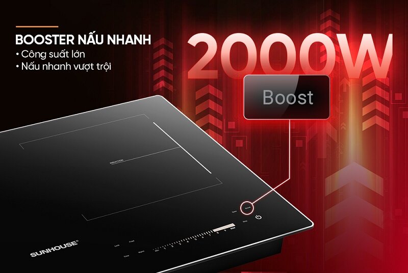 Đặc biệt, bếp từ Sunhouse này còn có tính năng Booster – chế độ gia nhiệt siêu nhanh. Khi đó, vùng nấu của bếp sẽ đạt công suất tối đa 2000W trong 8 phút, nhờ đó, việc đun sôi nước, luộc rau hay xào nấu trở nên nhanh chóng, đặc biệt hữu ích khi bận rộn.