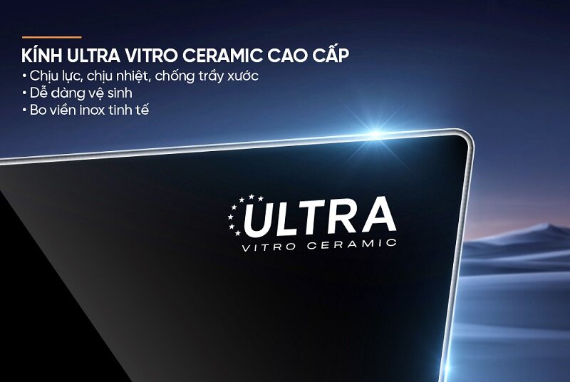 Một trong những điểm nhấn quan trọng của sản phẩm chính là mặt kính Ultra Vitro Ceramic cao cấp, có độ dày 4.0mm, màu đen nguyên khối sang trọng. Mặt kính không chỉ đẹp mà còn có khả năng chịu nhiệt và chịu lực tốt, có thể chịu tải lên đến 20kg. Điều này giúp bếp hoạt động bền bỉ, an toàn khi sử dụng nồi lớn hay va chạm trong quá trình nấu, đồng thời dễ dàng khi vệ sinh.