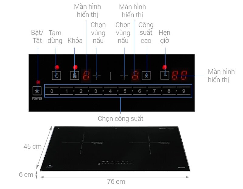 3. Công suất – Kích thước vùng nấu bếp từ Pramie PRMY-S1