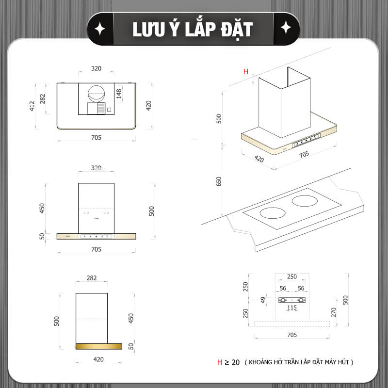 | Lưu ý lắp đặt | Lắp Độc Lập – Âm Tủ Đi đường ống thông gió: Phi 140mm – 160mm (Ống nhựa PVC) Đi loại dây chịu tải 2.5 Khoảng cách tiêu chuẩn từ mặt bếp lên đến máy hút mùi tối thiểu 65 -75cm |